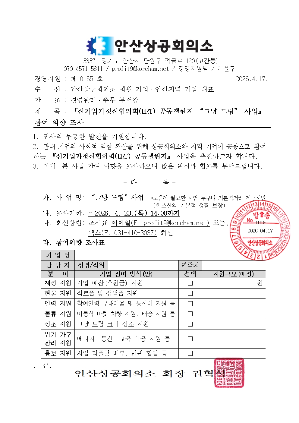 | ‒ | 『신기업가정신협의회(ERT) 공동챌린지 “그냥 드림” 사업』 참여 의향 조사 |