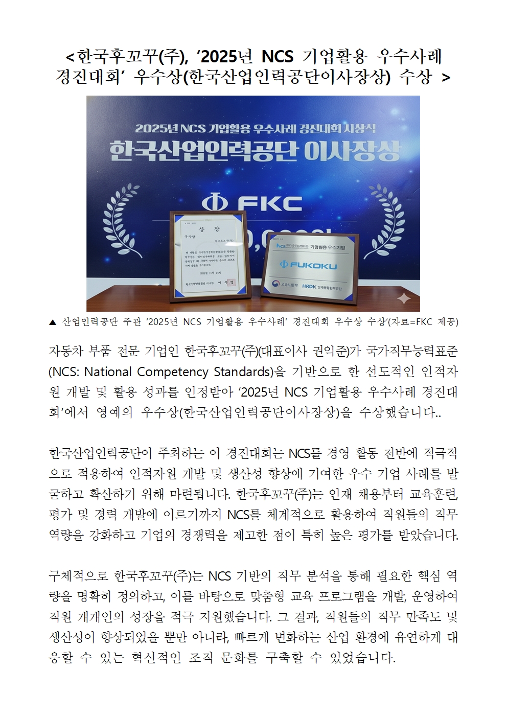 | 제목 | 한국후꼬꾸(주), '2025년 NCS 기업활용 우수사례 경진대회' 우수상(한국산업인력공단이사장상) 수상 | ||