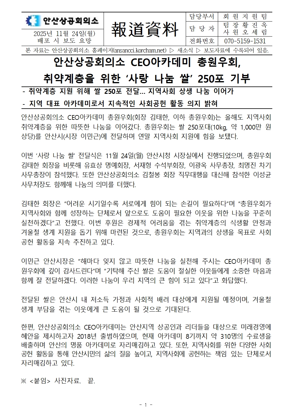 | ‒ | 안산상공회의소 CEO아카데미 총원우회, 취약계층을 위한 ‘사랑 나눔 쌀’ 250포 기부 |