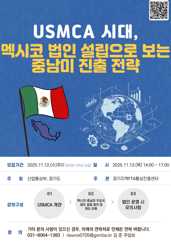 | 제목 | [경기지역FTA통상진흥센터] 『USMCA 시대, 멕시코 법인 설립으로 보는 중남미 진출 전략』 설명회 개최 안내 | ||
