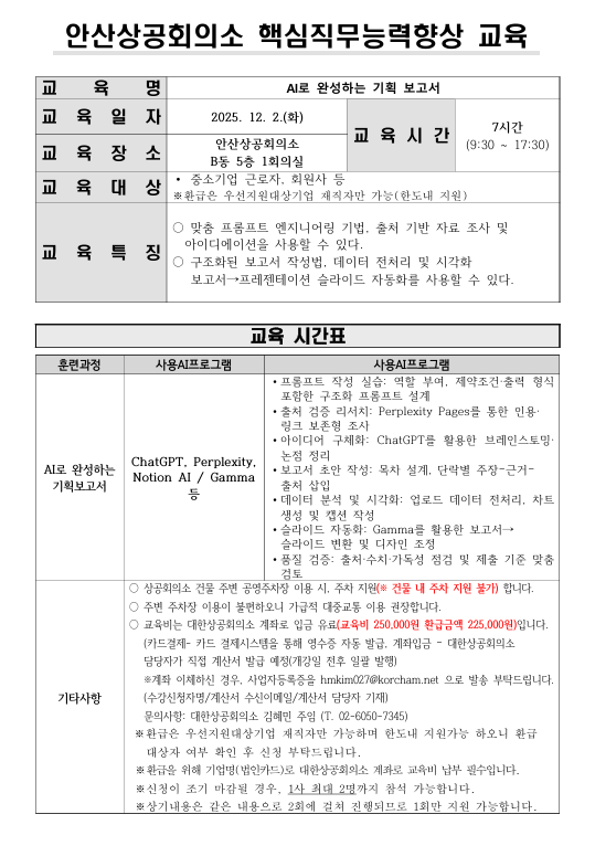 ※ [12/2] AI로 완성하는 기획보고서 교육 신청 바로가기 (링크 접속) ※ 11월 12월 동일한 내용이므로 두 교육 각각 1사 최대 2명까지 신청 가능 |