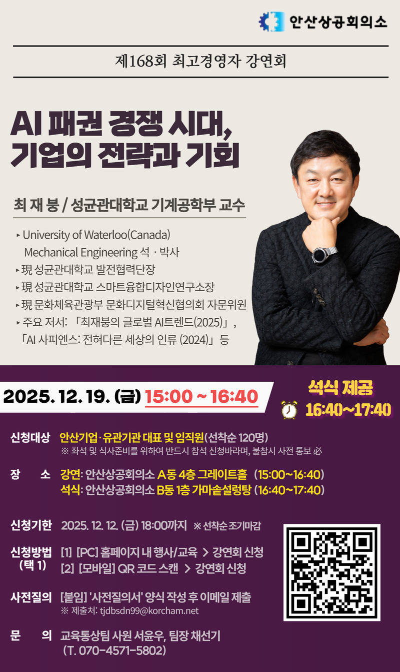 | 제목 | [12/19(금)] 제168회 최고경영자 강연회: AI 패권 경쟁 시대, 기업의 전략과 기회 | ||