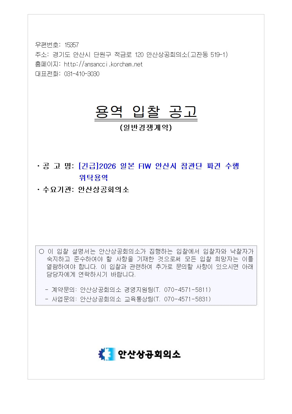 □ <긴급> 『2026 일본 FIW 안산시 참관단』 파견 수행 위탁용역 입찰 공고(협상에 의한 계약)
