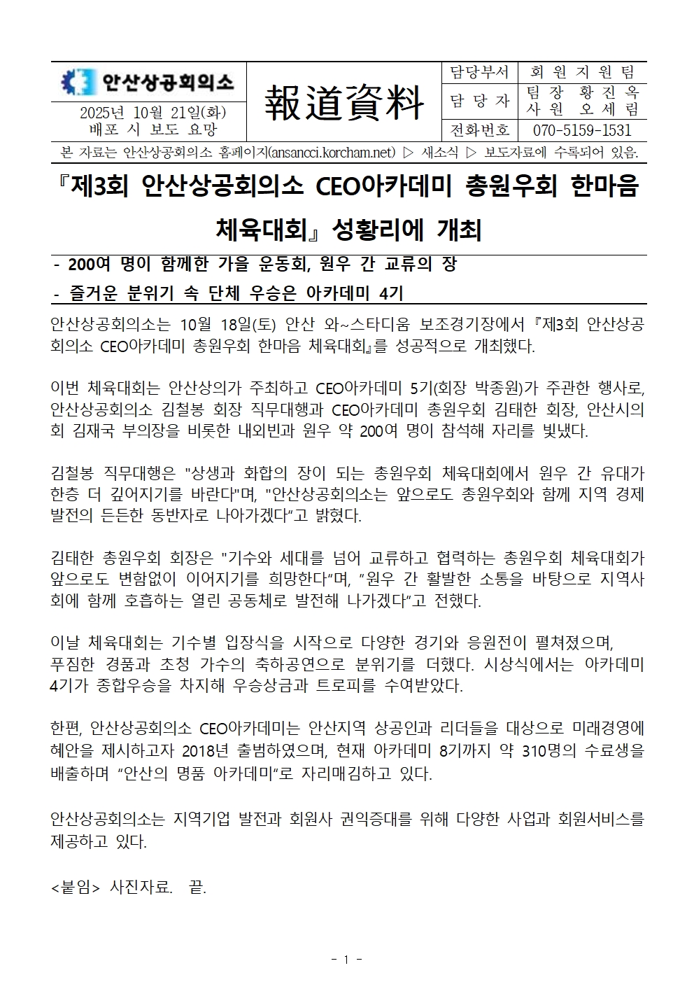제목 | 『제3회 안산상공회의소 CEO아카데미 총원우회 한마음 체육대회』 성황리에 개최 | ||