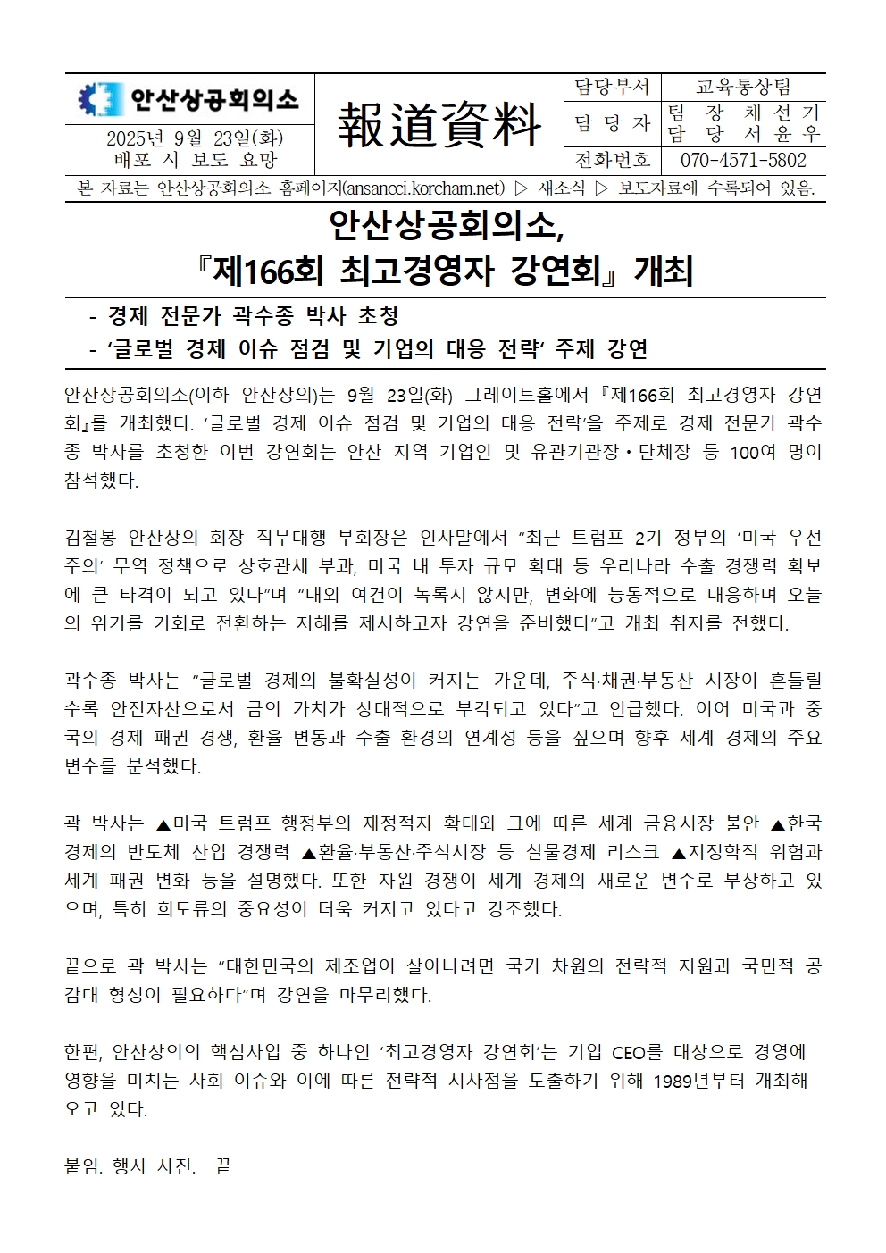 ‒ | 안산상공회의소, 제166회 최고경영자 강연회 개최 |