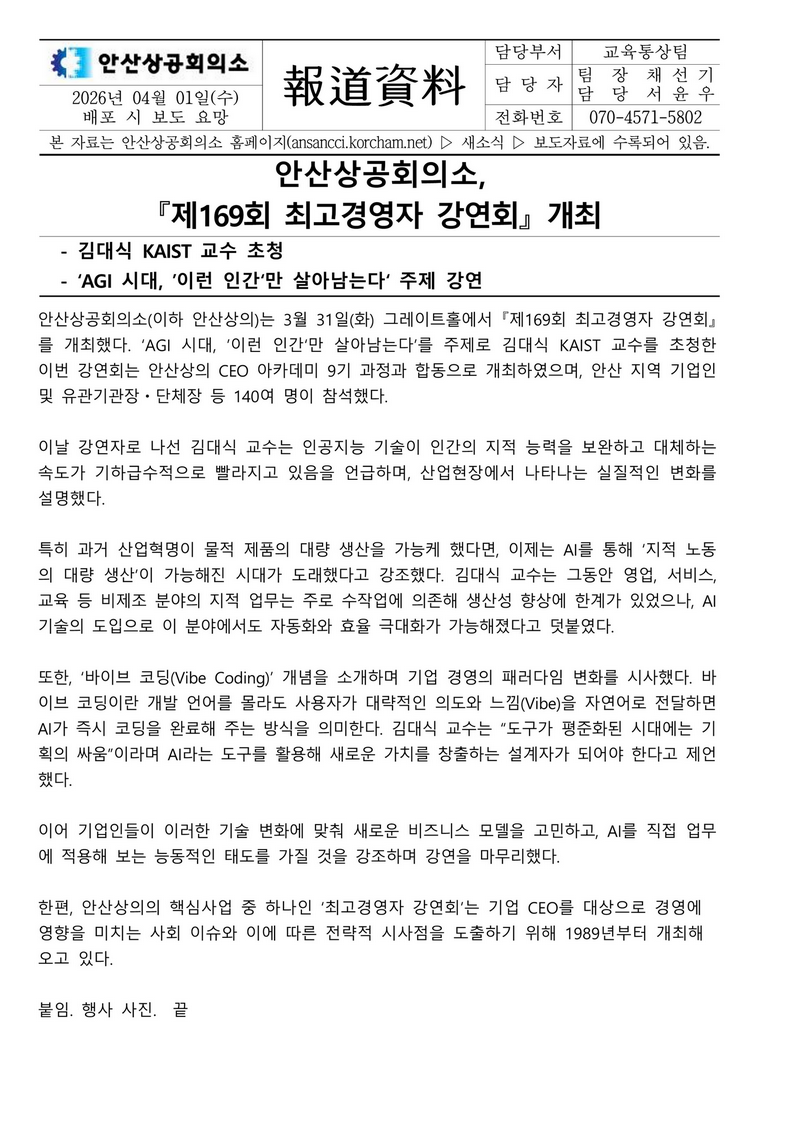 | ‒ | 안산상공회의소, 제 169회 최고경영자 강연회 개최 |