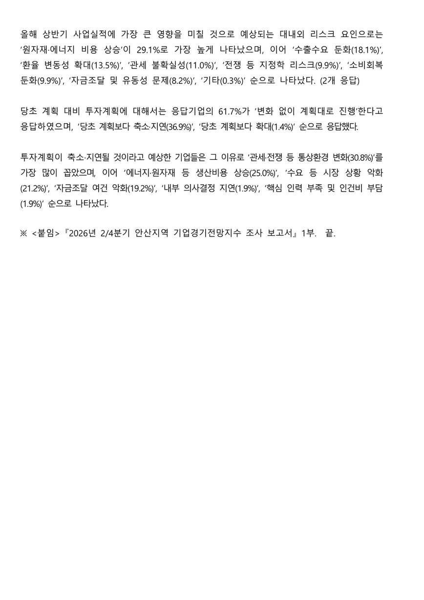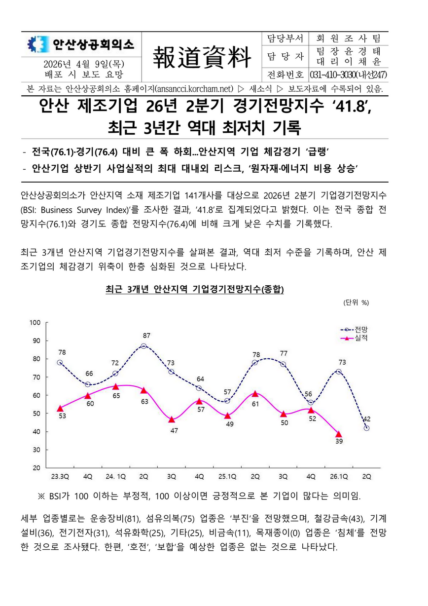 | ‒ | 안산 제조기업 26년 2분기 경기전망지수 '41.8', 최근 3년간 역대 최저치 기록 |