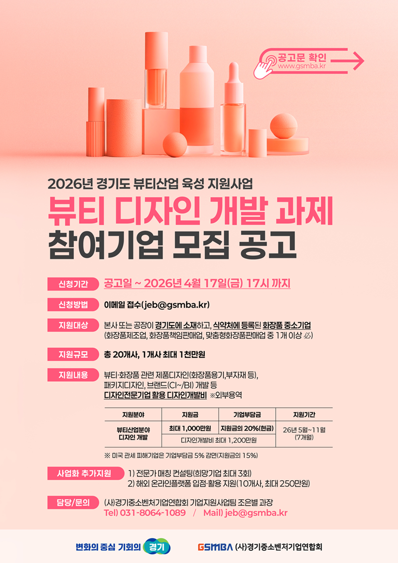| ‒ | [경기중소벤처기업연합회] 2026년 뷰티산업 육성 지원 사업(뷰티 디자인 개발 과제) 사업 안내 |